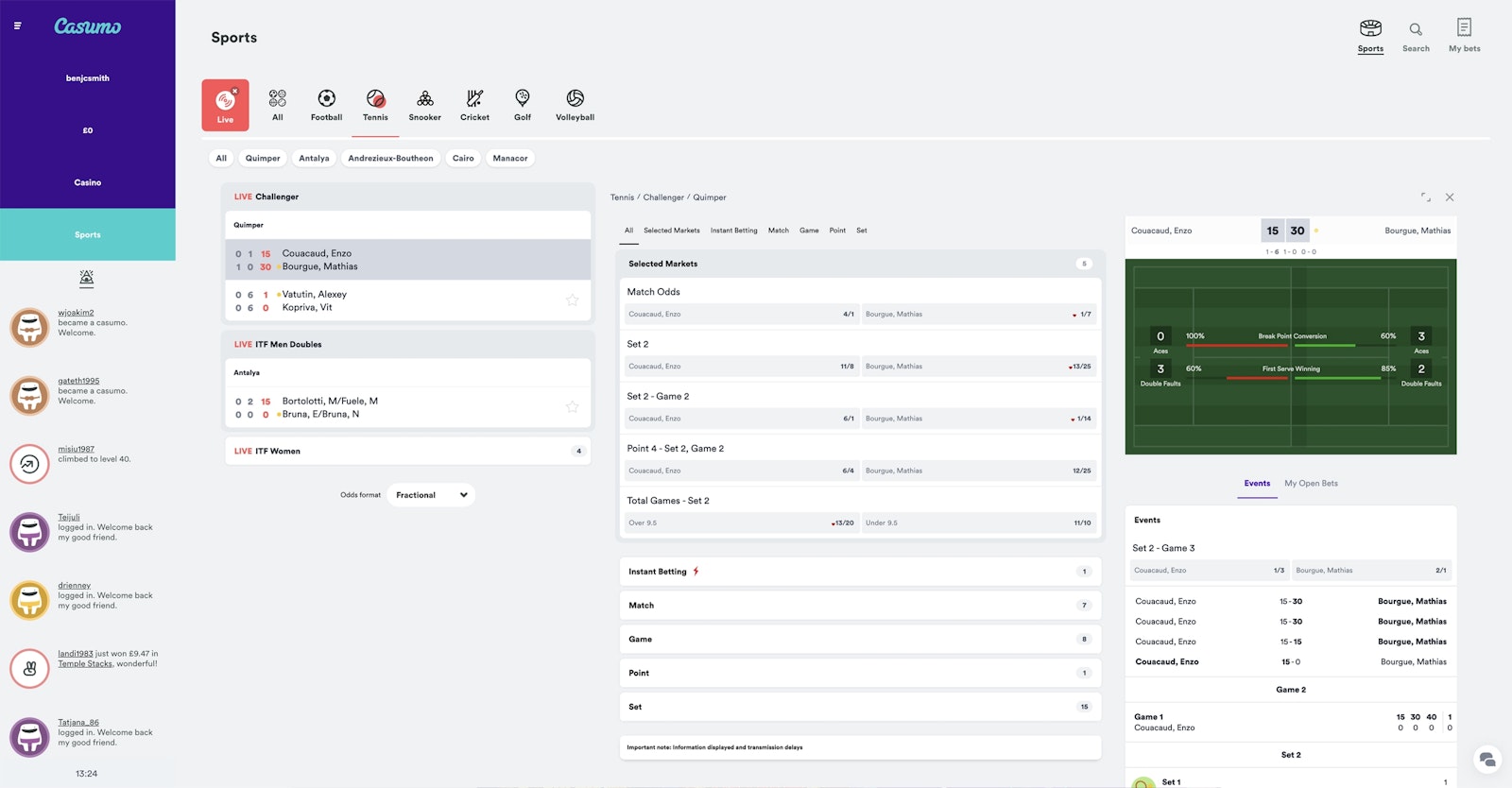 Popular sports like tennis are perfect for live betting on Casumo.