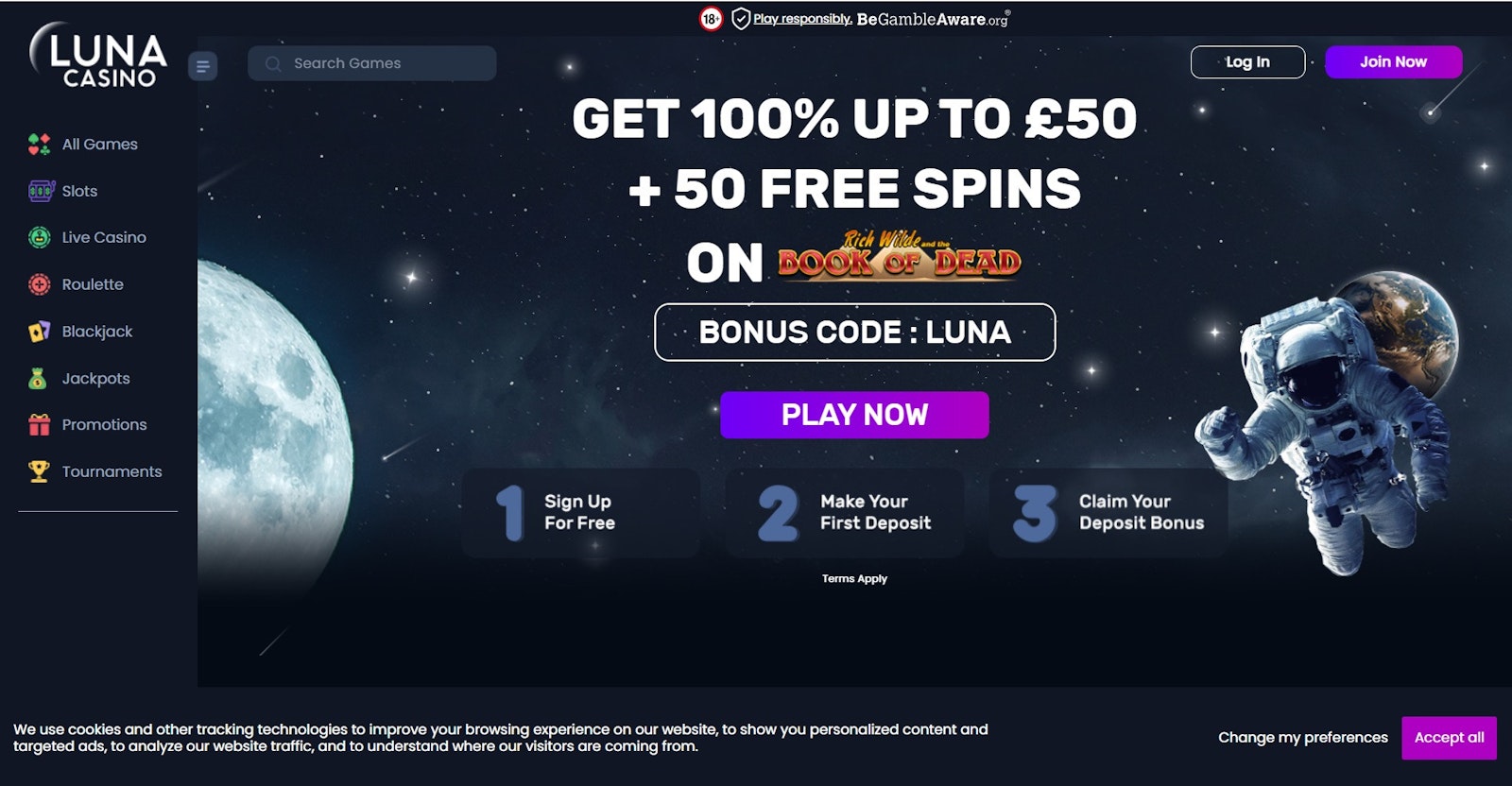 Claim a 100% welcome bonus of up to £50 at Luna Casino and 50 free spins on Book Of Dead slot. Simply follow the instructions below!
