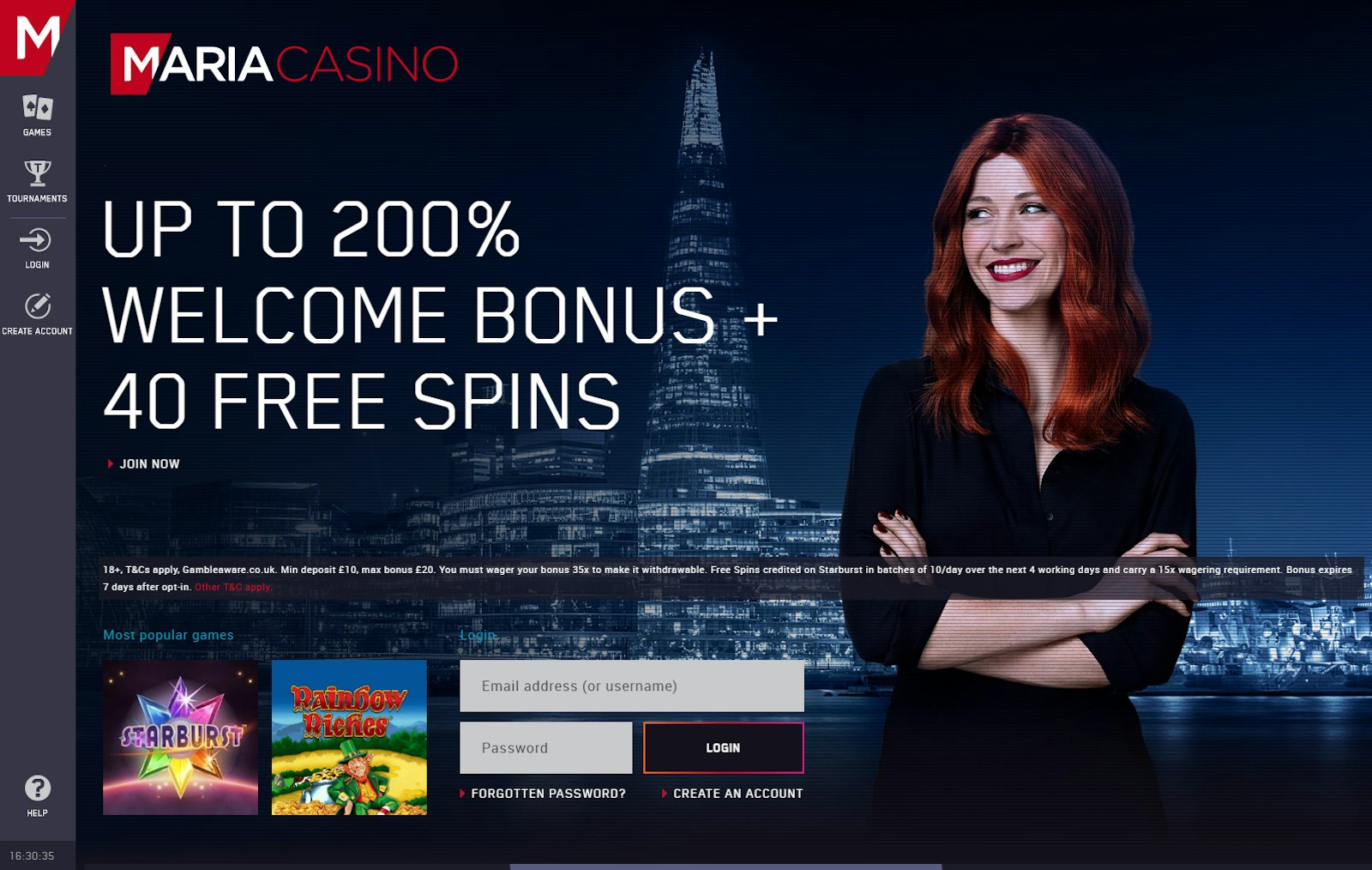 New customers at Maria Casino can choose between 3 welcome bonus offers. All bonus offers include 40 free spins at Starburst(10 per day for the 4 working days following your first deposit)