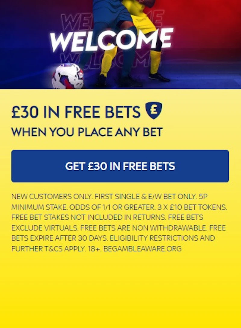 NEW CUSTOMERS ONLY. FIRST SINGLE & E/W BET ONLY. 5P MINIMUM STAKE. ODDS OF 1/1 OR GREATER. 3 X £10 BET TOKENS. FREE BET STAKES NOT INCLUDED IN RETURNS. FREE BETS EXCLUDE VIRTUALS. FREE BETS ARE NON WITHDRAWABLE. FREE BETS EXPIRE AFTER 30 DAYS. ELIGIBILITY RESTRICTIONS AND FURTHER T&CS APPLY. 18+. BEGAMBLEAWARE.ORG
