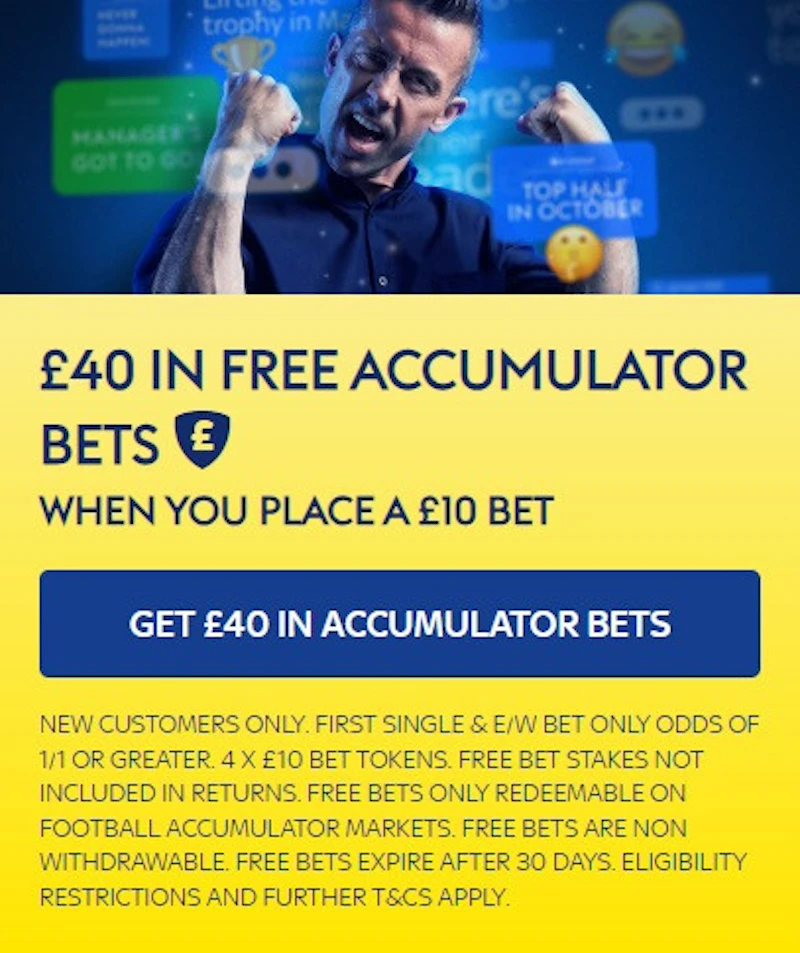 NEW CUSTOMERS ONLY. FIRST SINGLE & E/W BET ONLY ODDS OF 1/1 OR GREATER. 4 X £10 BET TOKENS. FREE BET STAKES NOT INCLUDED IN RETURNS. FREE BETS ONLY REDEEMABLE ON FOOTBALL ACCUMULATOR MARKETS. FREE BETS ARE NON WITHDRAWABLE. FREE BETS EXPIRE AFTER 30 DAYS. ELIGIBILITY RESTRICTIONS AND FURTHER T&CS APPLY.