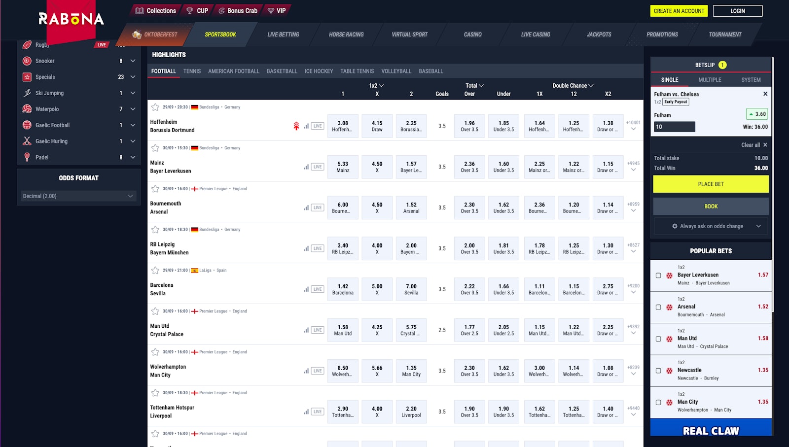 The name Rabona is a perfect fit for this sportsbook, as it not only symbolises a special football trick but also reflects the bookmaker's fervour for football betting. As expected, football takes centre stage here, and the list of football leagues that you can wager on is huge.